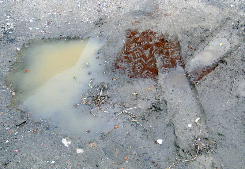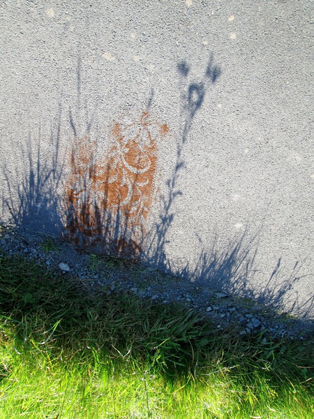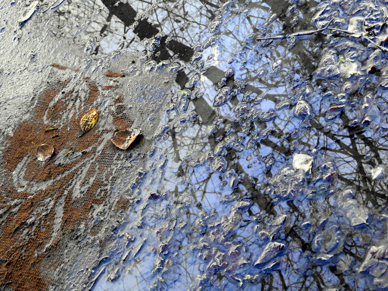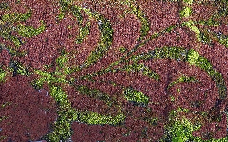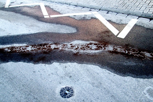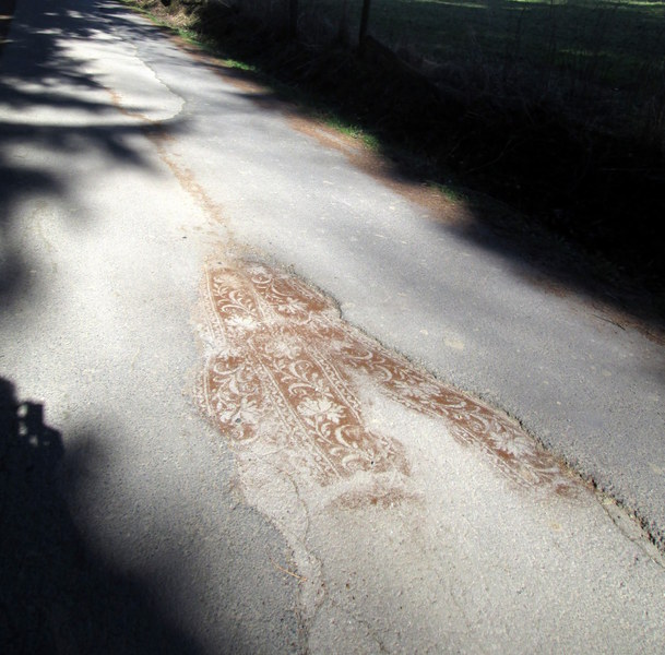 The floral carpet she is using adds to these Icelandic landscapes a poetic song. On streets and paths, sometime on the snow she spreads her printings, often made of coffee ground, sand or similar material. Her personal sign says - here I am- and is a sign of human ephemeral life in this eternal countryside.