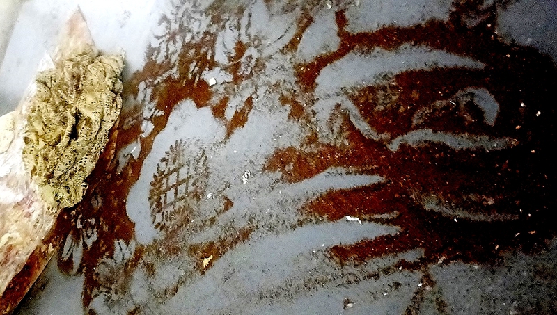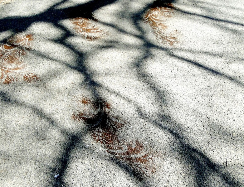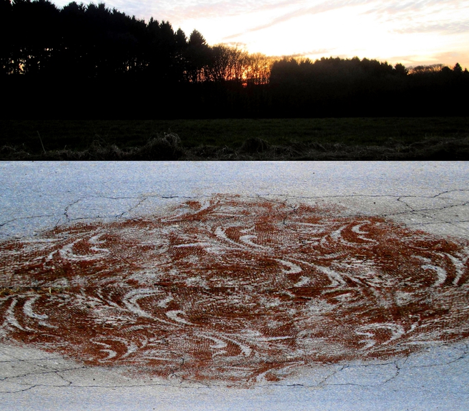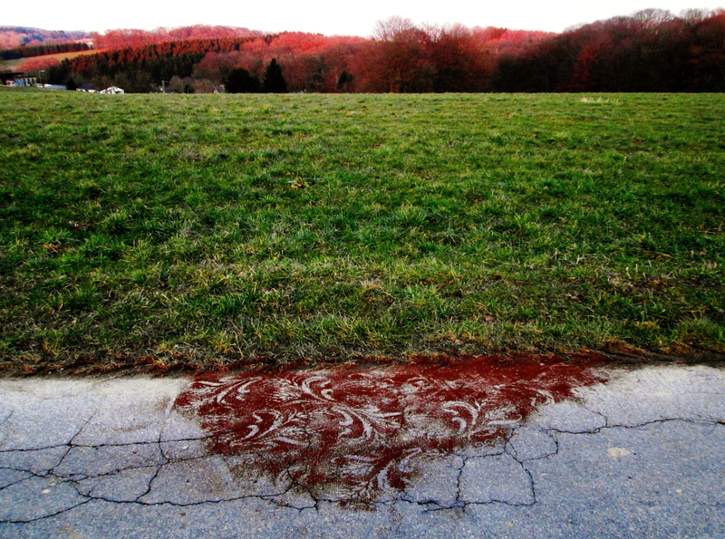 Wenn ich durch die Landschaft gehe, greife ich immer wieder minimalistisch in die Natur ein. Ich markiere Orte , hebe sie hervor und spüre ihren spezifischen Besonderheiten nach. Filigrane Muster aus Kaffeesatz verändern für kurze Zeit einen Ort. Es bleiben nur fotografische Erinnerungen.