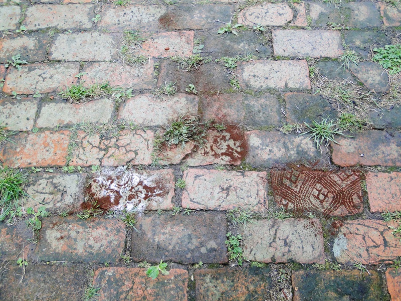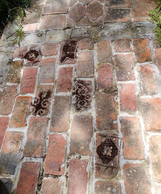 Margret Schopka verwendet filigrane, nach strengen Regeln gehäkelte, dekorative Spitzendecken, wie wir sie von unseren Großmüttern her kennen. Sie übersetzt diese in das Medium einer Landartzeichnung. Schon seit einiger Zeit verarbeitet sie Naturmaterialien zu ornamentalen Teppichen und weitgreifenden Landschaftsarbeiten. Eine dunkelbraune Ornamentalik, entstanden aus Kaffeesatz von unzähligen Kaffees, den sie über Spitzendecken siebte. „Braunpause“ nennt sie die Züricher Arbeit der Serie „bei meinen Freundinnen zum Kaffee“ Der Farbkontrast des Kaffees zum Boden betont als Negativ die ornamentalen Gestaltungsprinzipien der Häkelspitze. Harmonisch verbindet die dunkle und duftende Zeichnung den Innen- und Außenraum. Tischkultur und Landartkunst, den Ort Remise und die Menschen hier und aktiviert Erinnerungen an das Zusammensein mit Freunden und Familie. Der Naturrhythmus wird topo-grafisch und sozial geprägt. Nur Fotos werden die Arbeit überdauern.