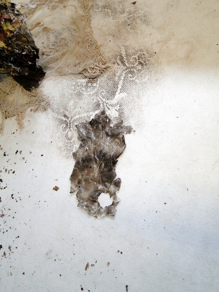 Objekte aus Folien, Rückseiten von Teppichboden collagiert mit Blütenblättern Spitzen, Plastikdecken, 2016/2023